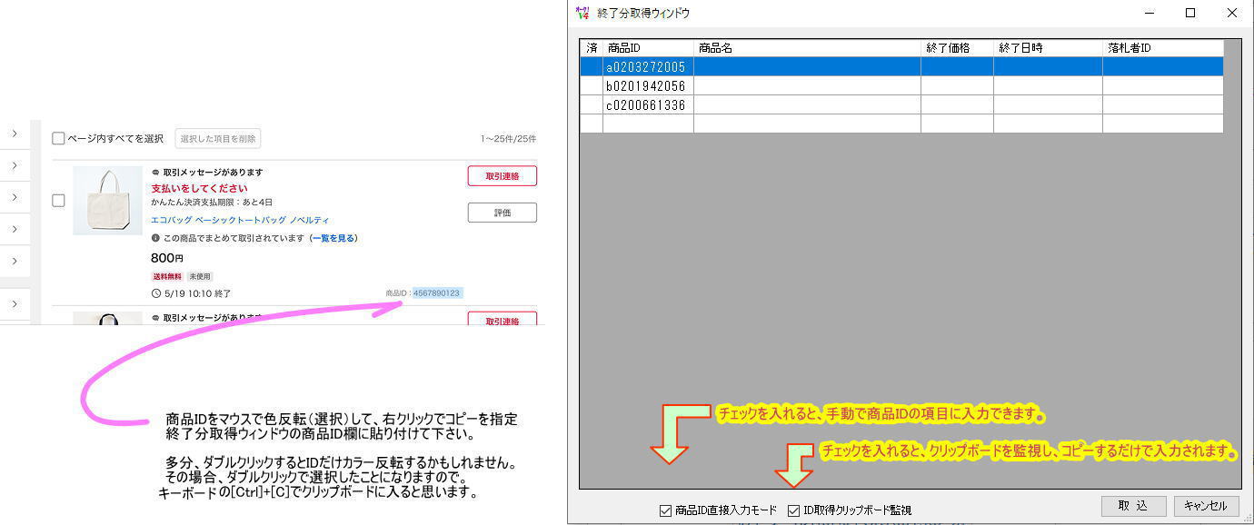 AucLifeV4 終了分取込ウィンドウ の 商品IDに入力して下さい。
