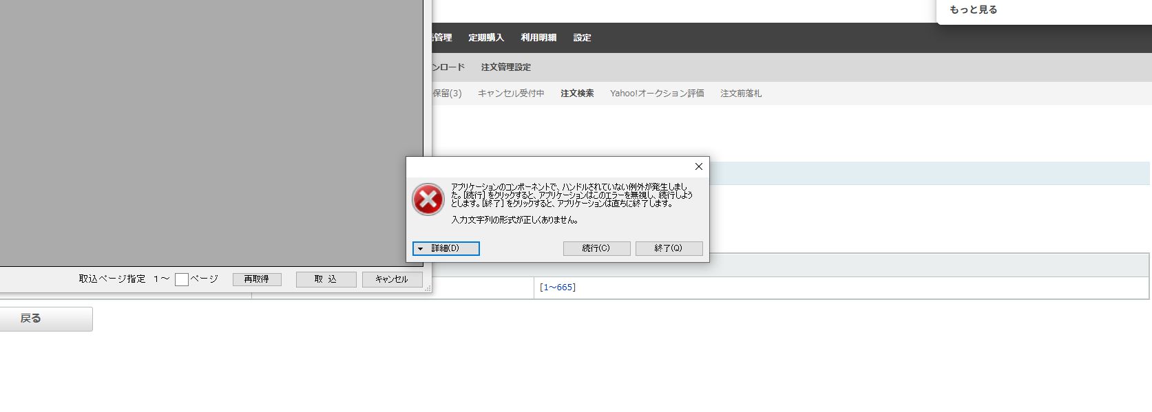 注文取得タグにて商品の取込をしようとすると、アプリケーションのコンポーネントで~入力文字列の形式が正しくありません。とポップアップが表示されここから先に進めません。
